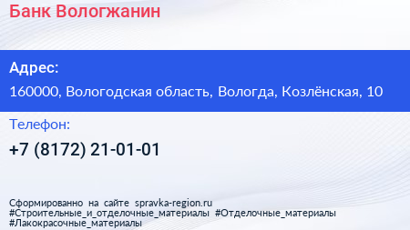 Банк Вологжанин по адресу 160000, Вологодская область, Вологда, Козлёнская, 10 в дальнейшем Организация, размещена в следующих категориях: