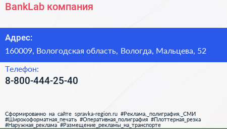 BankLab, компания по адресу 160009, Вологодская область, Вологда, Мальцева, 52 в дальнейшем Организация, размещена в следующих категориях: