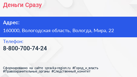 Деньги Сразу по адресу 160000, Вологодская область, Вологда, Мира, 22 в дальнейшем Организация, размещена в следующих категориях: