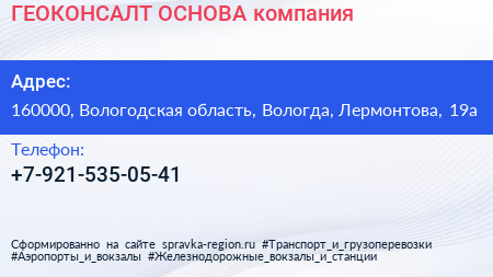 ГЕОКОНСАЛТ ОСНОВА, компания по адресу 160000, Вологодская область, Вологда, Лермонтова, 19а в дальнейшем Организация, размещена в следующих категориях:
