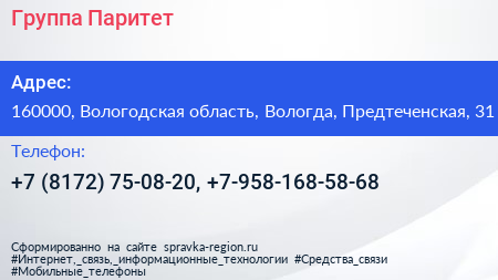 Группа Паритет по адресу 160000, Вологодская область, Вологда, Предтеченская, 31 в дальнейшем Организация, размещена в следующих категориях: