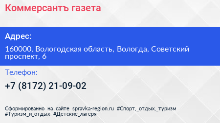 Коммерсантъ, газета по адресу 160000, Вологодская область, Вологда, Советский проспект, 6 в дальнейшем Организация, размещена в следующих категориях: