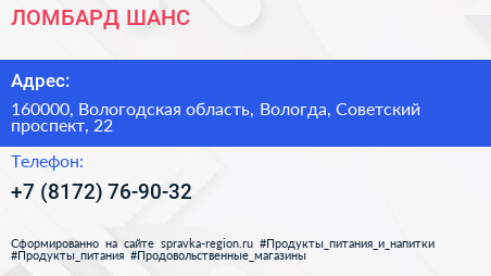 ЛОМБАРД-ШАНС по адресу 160000, Вологодская область, Вологда, Советский проспект, 22 в дальнейшем Организация, размещена в следующих категориях: