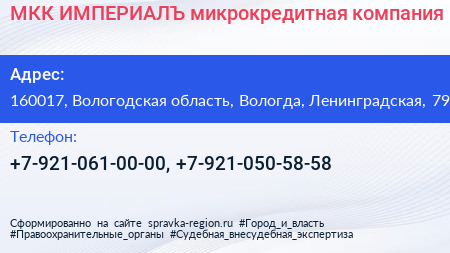 МКК ИМПЕРИАЛЪ, микрокредитная компания по адресу 160017, Вологодская область, Вологда, Ленинградская, 79 в дальнейшем Организация, размещена в следующих категориях: