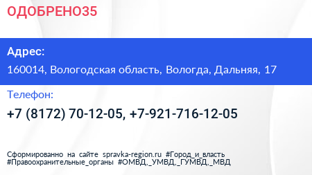 ОДОБРЕНО35 по адресу 160014, Вологодская область, Вологда, Дальняя, 17 в дальнейшем Организация, размещена в следующих категориях: