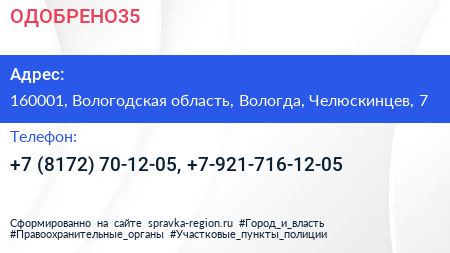 ОДОБРЕНО35 по адресу 160001, Вологодская область, Вологда, Челюскинцев, 7 в дальнейшем Организация, размещена в следующих категориях: