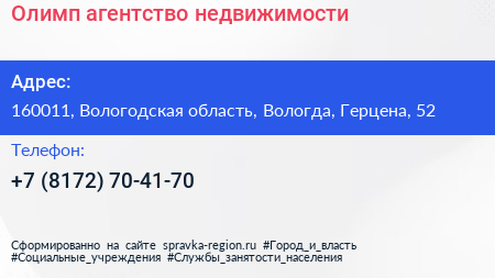 Олимп, агентство недвижимости по адресу 160011, Вологодская область, Вологда, Герцена, 52 в дальнейшем Организация, размещена в следующих категориях: