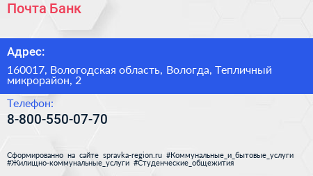 Почта Банк по адресу 160017, Вологодская область, Вологда, Тепличный микрорайон, 2 в дальнейшем Организация, размещена в следующих категориях: