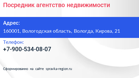 Посредник, агентство недвижимости по адресу 160001, Вологодская область, Вологда, Кирова, 21 в дальнейшем Организация, размещена в следующих категориях: