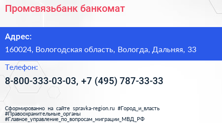 Промсвязьбанк, банкомат по адресу 160024, Вологодская область, Вологда, Дальняя, 33 в дальнейшем Организация, размещена в следующих категориях: