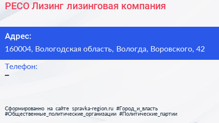 РЕСО-Лизинг, лизинговая компания по адресу 160004, Вологодская область, Вологда, Воровского, 42 в дальнейшем Организация, размещена в следующих категориях:
