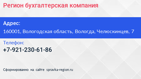 Регион, бухгалтерская компания по адресу 160001, Вологодская область, Вологда, Челюскинцев, 7 в дальнейшем Организация, размещена в следующих категориях: