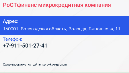 РоСТфинанс, микрокредитная компания по адресу 160001, Вологодская область, Вологда, Батюшкова, 11 в дальнейшем Организация, размещена в следующих категориях: