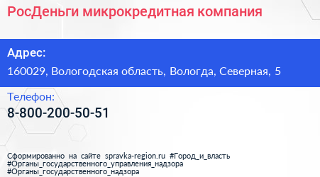 РосДеньги, микрокредитная компания по адресу 160029, Вологодская область, Вологда, Северная, 5 в дальнейшем Организация, размещена в следующих категориях: