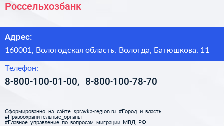 Россельхозбанк по адресу 160001, Вологодская область, Вологда, Батюшкова, 11 в дальнейшем Организация, размещена в следующих категориях: