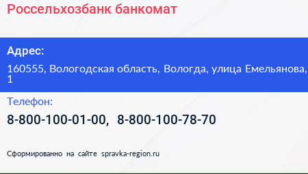 Россельхозбанк, банкомат по адресу 160555, Вологодская область, Вологда, улица Емельянова, 1 в дальнейшем Организация, размещена в следующих категориях:
