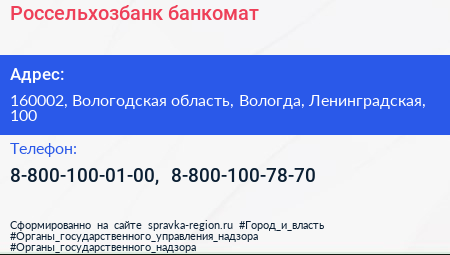 Россельхозбанк, банкомат по адресу 160002, Вологодская область, Вологда, Ленинградская, 100 в дальнейшем Организация, размещена в следующих категориях: