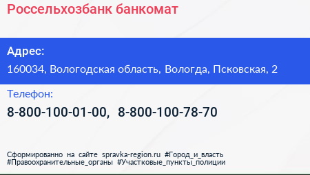 Россельхозбанк, банкомат по адресу 160034, Вологодская область, Вологда, Псковская, 2 в дальнейшем Организация, размещена в следующих категориях: