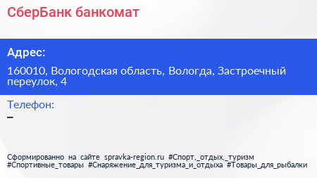 СберБанк, банкомат по адресу 160010, Вологодская область, Вологда, Застроечный переулок, 4 в дальнейшем Организация, размещена в следующих категориях: