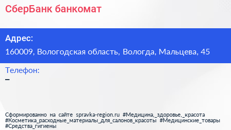 СберБанк, банкомат по адресу 160009, Вологодская область, Вологда, Мальцева, 45 в дальнейшем Организация, размещена в следующих категориях:
