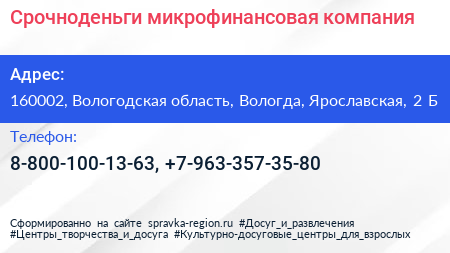 Срочноденьги, микрофинансовая компания по адресу 160002, Вологодская область, Вологда, Ярославская, 2 Б в дальнейшем Организация, размещена в следующих категориях:
