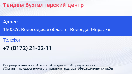 Тандем, бухгалтерский центр по адресу 160009, Вологодская область, Вологда, Мира, 76 в дальнейшем Организация, размещена в следующих категориях:
