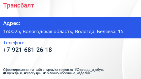 Трансбалт по адресу 160025, Вологодская область, Вологда, Беляева, 15 в дальнейшем Организация, размещена в следующих категориях:
