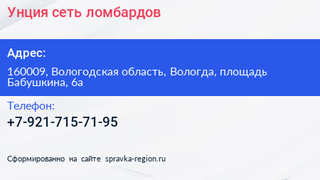 Унция, сеть ломбардов по адресу 160009, Вологодская область, Вологда, площадь Бабушкина, 6а в дальнейшем Организация, размещена в следующих категориях: