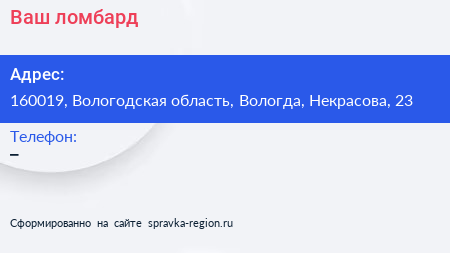 Ваш ломбард по адресу 160019, Вологодская область, Вологда, Некрасова, 23 в дальнейшем Организация, размещена в следующих категориях: