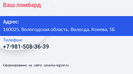 Ваш ломбард по адресу 160025, Вологодская область, Вологда, Конева, 5Б в дальнейшем Организация, размещена в следующих категориях: