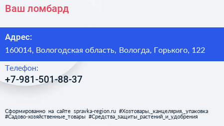 Ваш ломбард по адресу 160014, Вологодская область, Вологда, Горького, 122 в дальнейшем Организация, размещена в следующих категориях:
