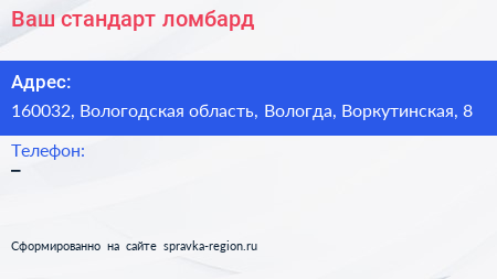 Ваш стандарт, ломбард по адресу 160032, Вологодская область, Вологда, Воркутинская, 8 в дальнейшем Организация, размещена в следующих категориях: