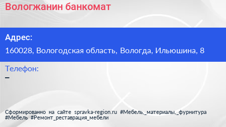 Вологжанин, банкомат по адресу 160028, Вологодская область, Вологда, Ильюшина, 8 в дальнейшем Организация, размещена в следующих категориях: