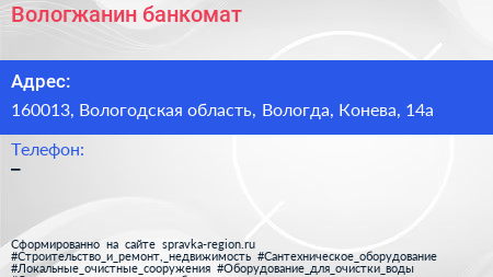 Вологжанин, банкомат по адресу 160013, Вологодская область, Вологда, Конева, 14а в дальнейшем Организация, размещена в следующих категориях: