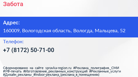 Забота по адресу 160009, Вологодская область, Вологда, Мальцева, 52 в дальнейшем Организация, размещена в следующих категориях: