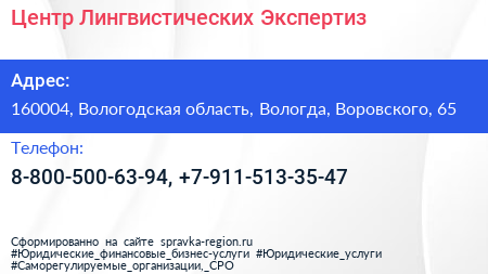Центр Лингвистических Экспертиз по адресу 160004, Вологодская область, Вологда, Воровского, 65 в дальнейшем Организация, размещена в следующих категориях: