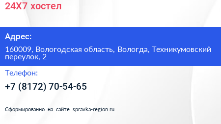 24Х7, хостел по адресу 160009, Вологодская область, Вологда, Техникумовский переулок, 2 в дальнейшем Организация, размещена в следующих категориях: