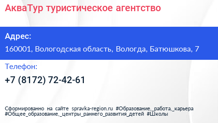 АкваТур, туристическое агентство по адресу 160001, Вологодская область, Вологда, Батюшкова, 7 в дальнейшем Организация, размещена в следующих категориях: