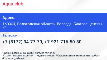 Aqua club по адресу 160004, Вологодская область, Вологда, Благовещенская, 74 в дальнейшем Организация, размещена в следующих категориях: