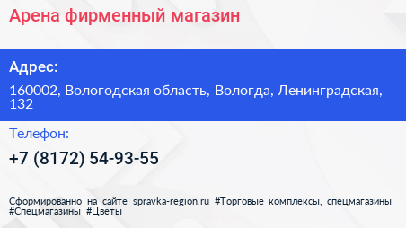 Арена, фирменный магазин по адресу 160002, Вологодская область, Вологда, Ленинградская, 132 в дальнейшем Организация, размещена в следующих категориях: