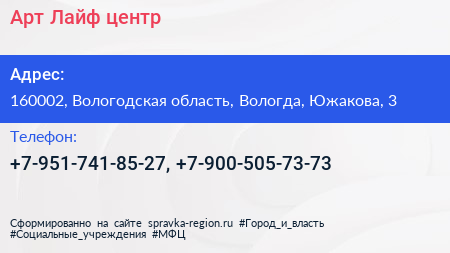 Арт Лайф, центр по адресу 160002, Вологодская область, Вологда, Южакова, 3 в дальнейшем Организация, размещена в следующих категориях: