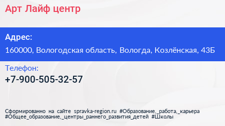 Арт Лайф, центр по адресу 160000, Вологодская область, Вологда, Козлёнская, 43Б в дальнейшем Организация, размещена в следующих категориях:
