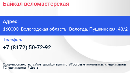 Байкал, веломастерская по адресу 160000, Вологодская область, Вологда, Пушкинская, 43/2 в дальнейшем Организация, размещена в следующих категориях: