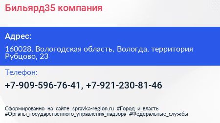 Бильярд35, компания по адресу 160028, Вологодская область, Вологда, территория Рубцово, 23 в дальнейшем Организация, размещена в следующих категориях:
