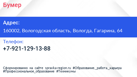 Бумер по адресу 160002, Вологодская область, Вологда, Гагарина, 64 в дальнейшем Организация, размещена в следующих категориях: