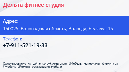 Дельта, фитнес-студия по адресу 160025, Вологодская область, Вологда, Беляева, 15 в дальнейшем Организация, размещена в следующих категориях: