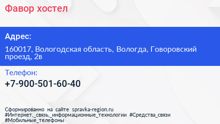 Фавор, хостел по адресу 160017, Вологодская область, Вологда, Говоровский проезд, 2в в дальнейшем Организация, размещена в следующих категориях: