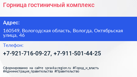 Горница, гостиничный комплекс по адресу 160549, Вологодская область, Вологда, Октябрьская улица, 46 в дальнейшем Организация, размещена в следующих категориях:
