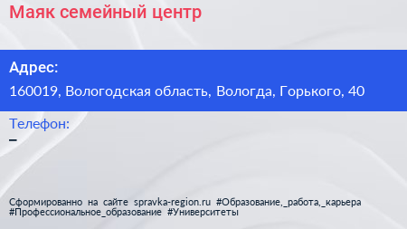 Маяк, семейный центр по адресу 160019, Вологодская область, Вологда, Горького, 40 в дальнейшем Организация, размещена в следующих категориях: