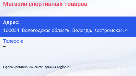 Магазин спортивных товаров по адресу 160034, Вологодская область, Вологда, Костромская, 4 в дальнейшем Организация, размещена в следующих категориях: